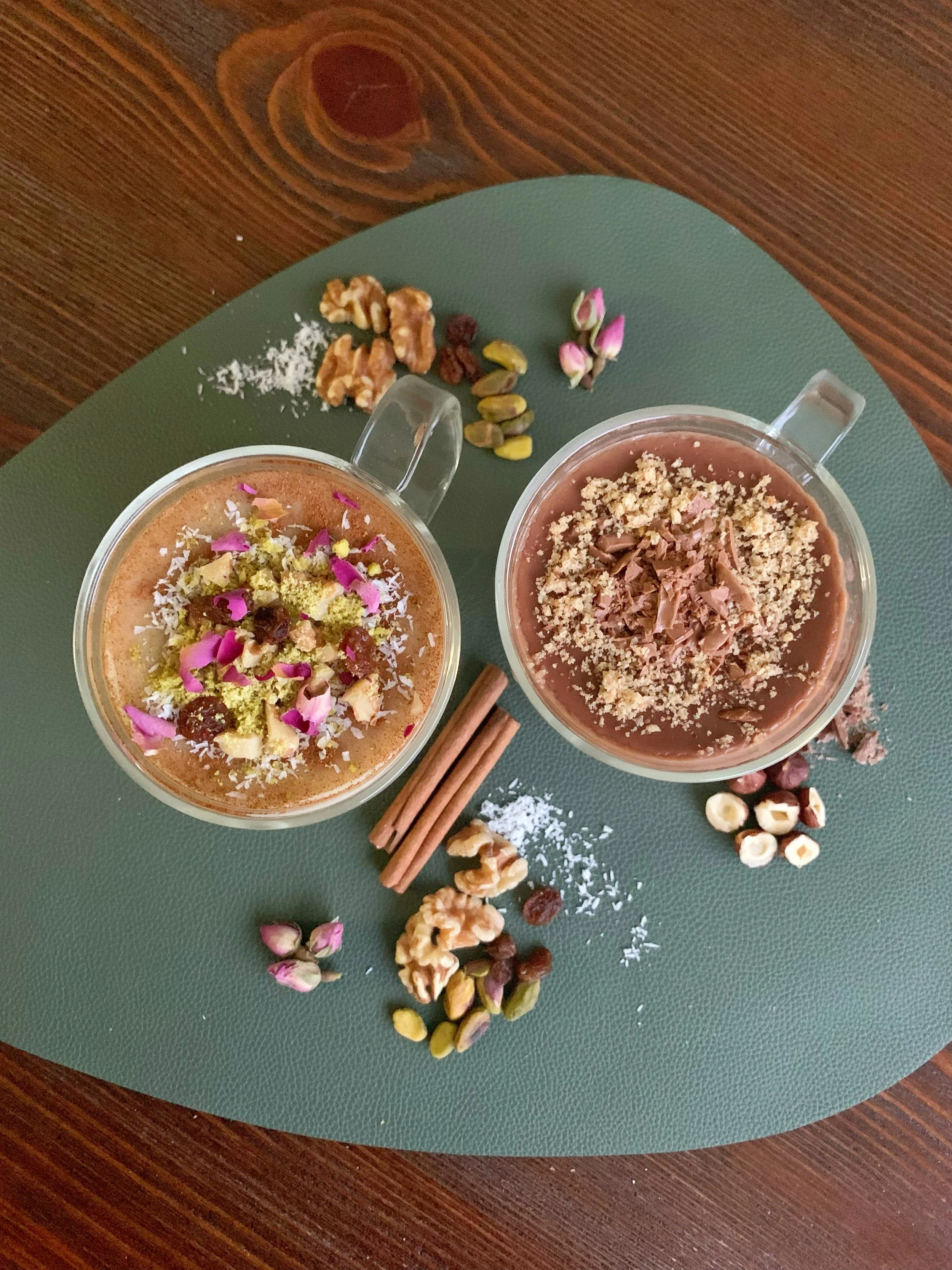 I've created two dairy-free versions of this very popular drink using oat milk. Oat milk is very creamy and is a delicious - arguably even better tasting - substitute to milk! The first is the classic sahlab with all the toppings and the second is a chocolate sahlab for all you chocolate lovers out there! It is such a fun twist on the classic sahlab drink - think of it as hot chocolate's cousin!