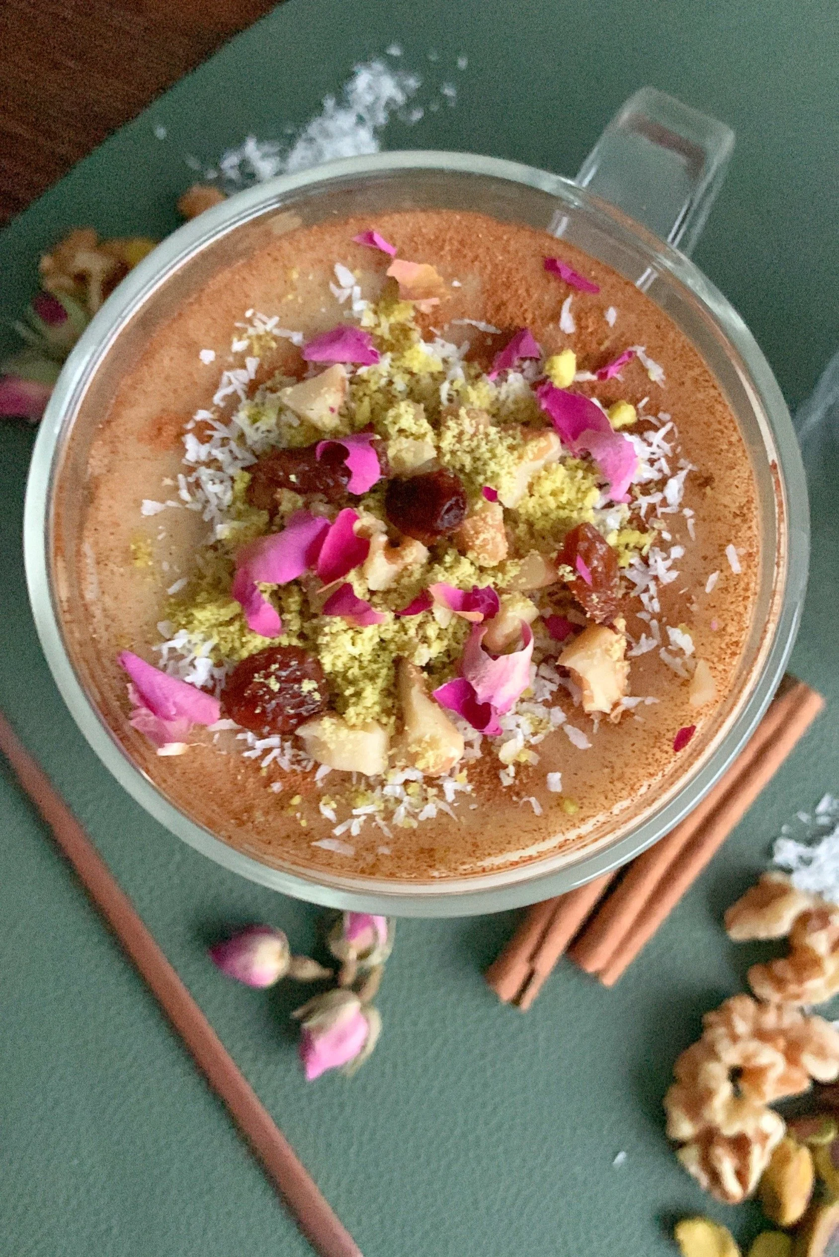 Traditionally, Sahlab is prepared using hot, sweetened milk and sahlab powder - adding mastic, rose water and vanilla extract for added flavor. Topped with cinnamon, shredded coconut, raisins and nuts like pistachios & walnuts for amazing texture and crunch. This drink is a wholesome treat!