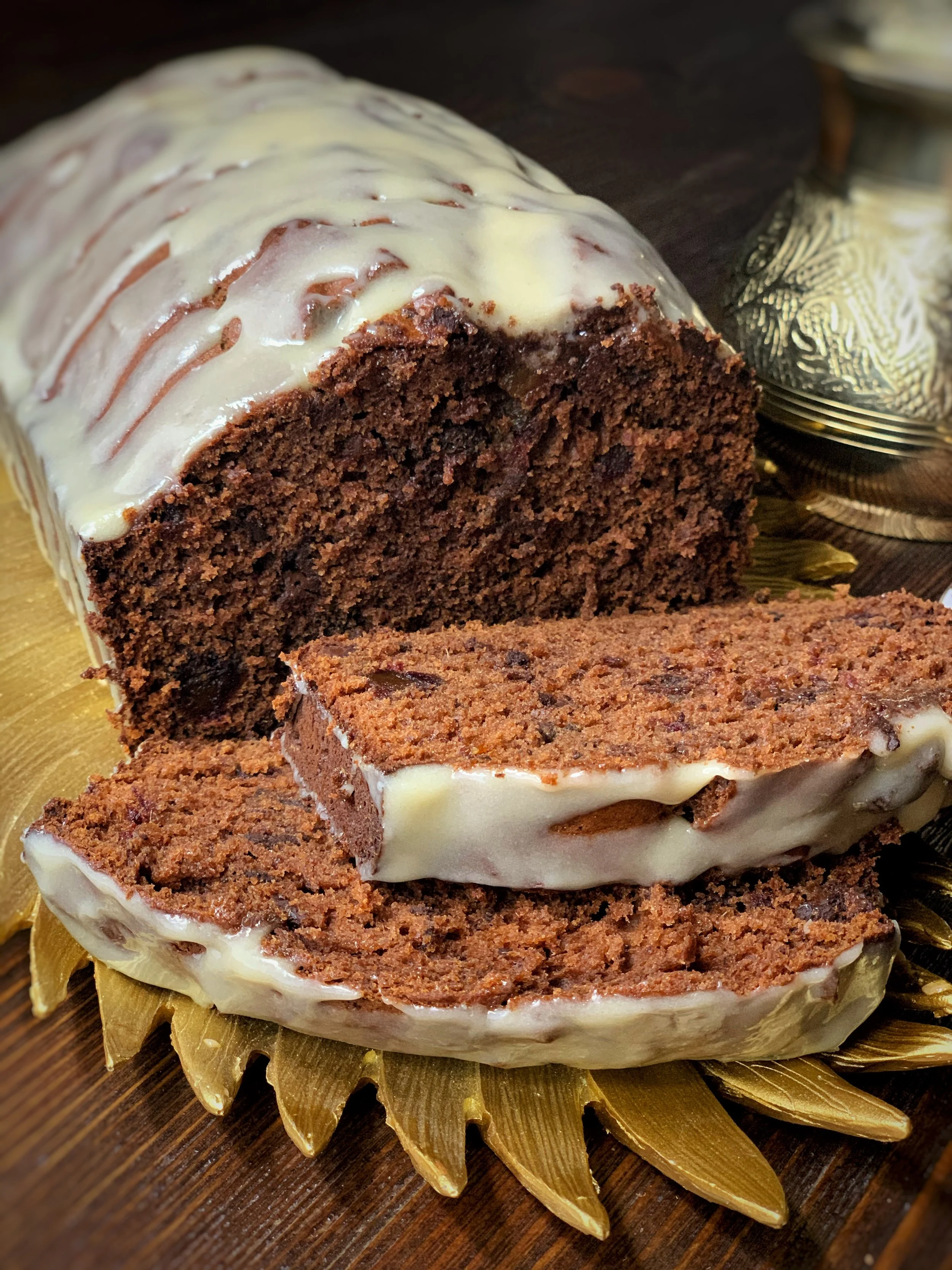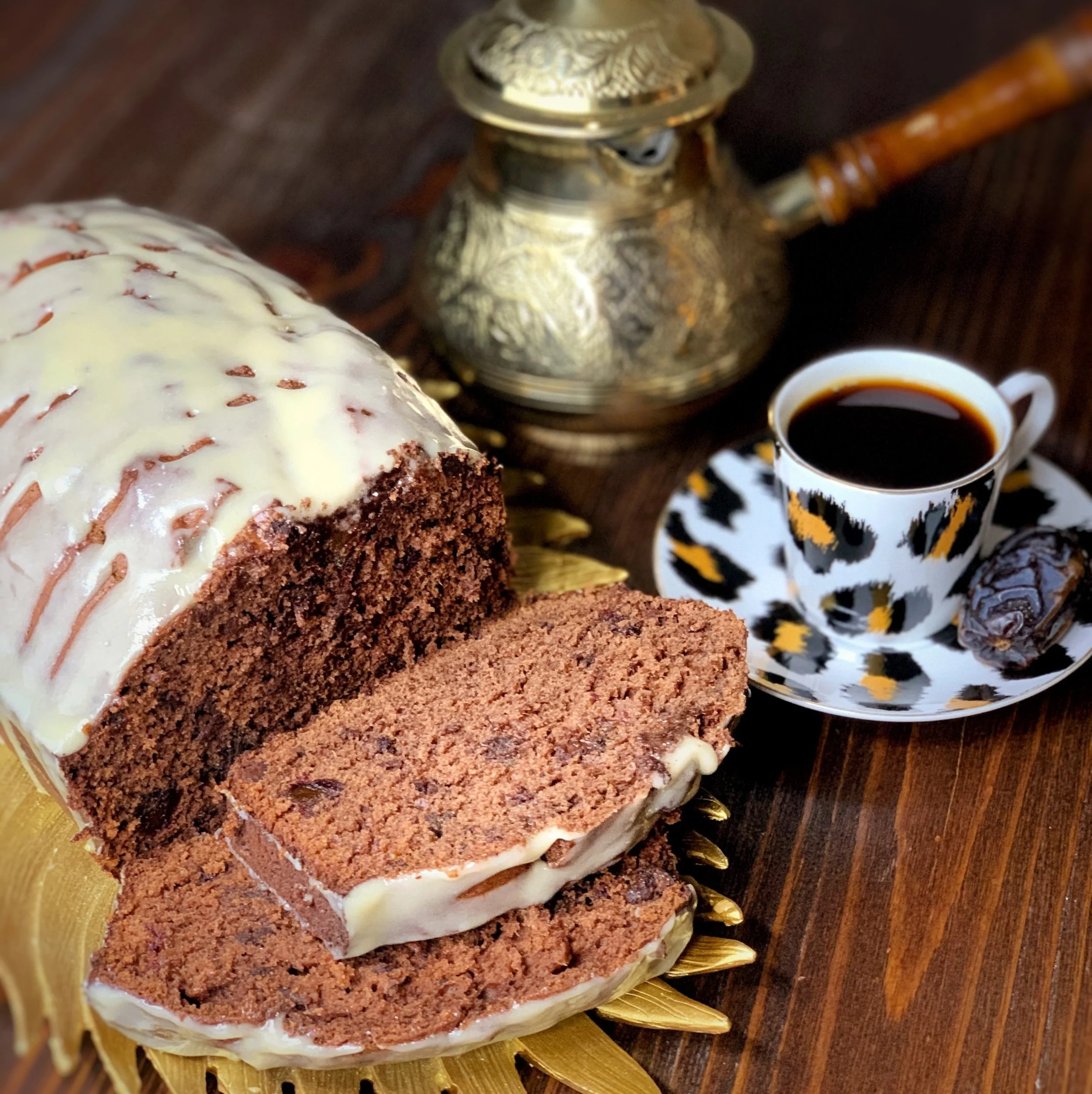 This is a delicious, moist, soft cake with small chunks of dates & dark chocolate topped with a toasty, nutty & sweet tahini glaze! Dare I say this cake is good for you? Dates are delicious, chewy, packed with health benefits & are an amazing sweetener. They add a subtle caramel-like flavor to the cake. The tahini glaze adds a nutty, sweet flavor and is also packed with healthy fats & vitamins.