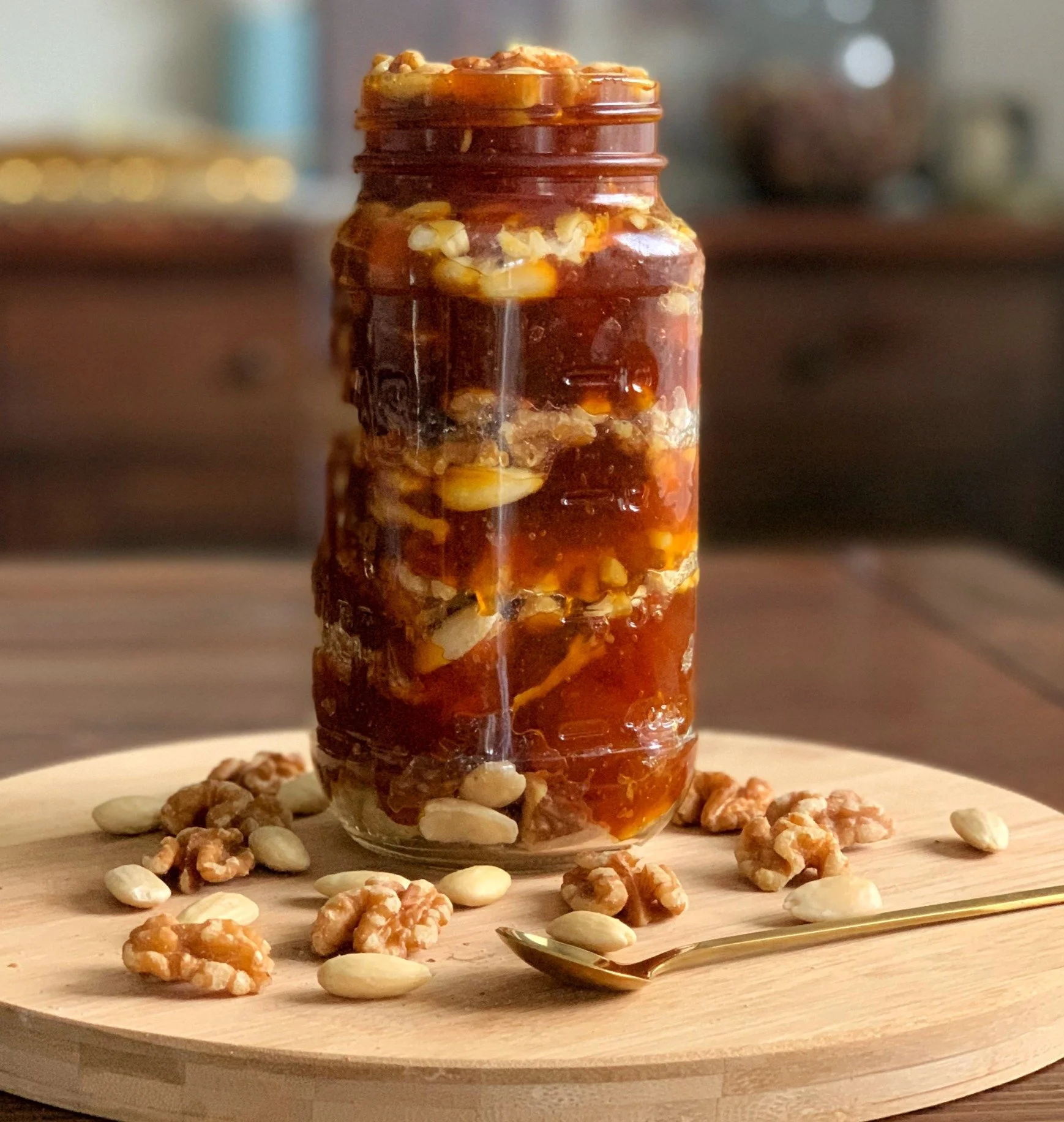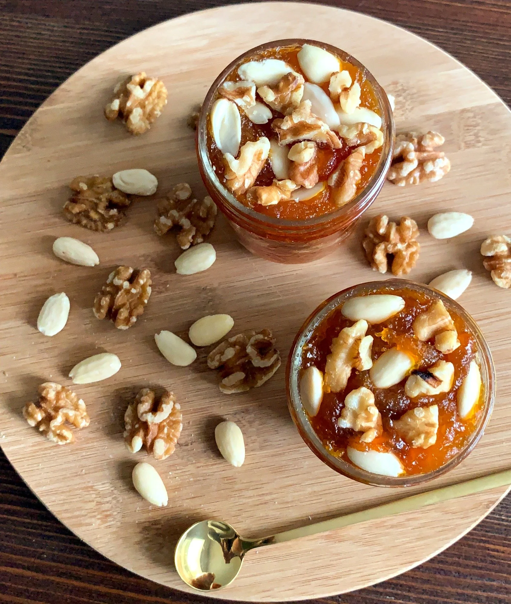 Once cooled completely, place in mason jars with almonds and walnuts. Alternating layers of nuts and pumpkin preserve. Store in the fridge.